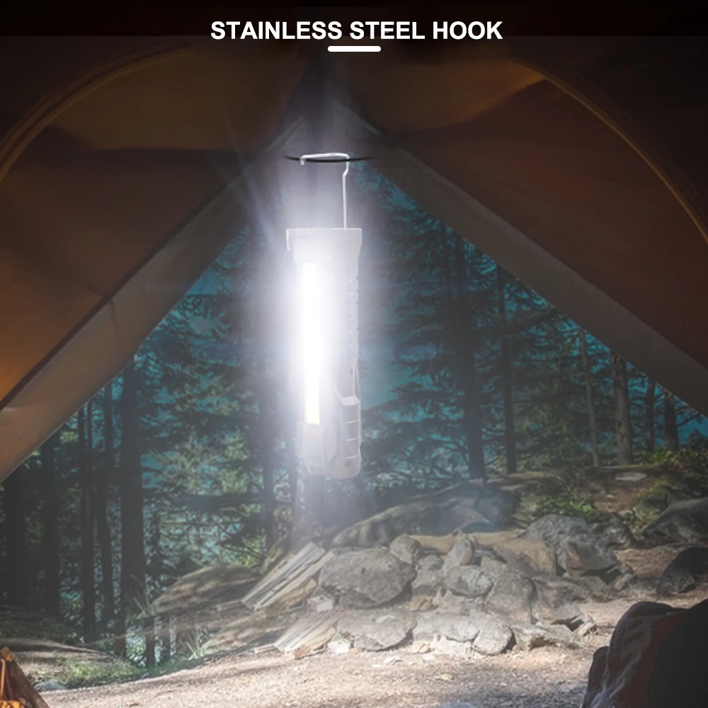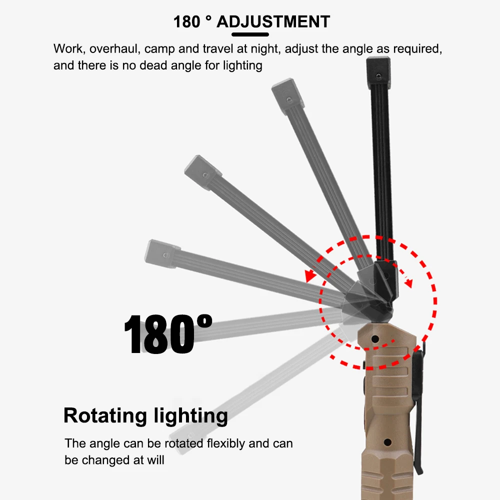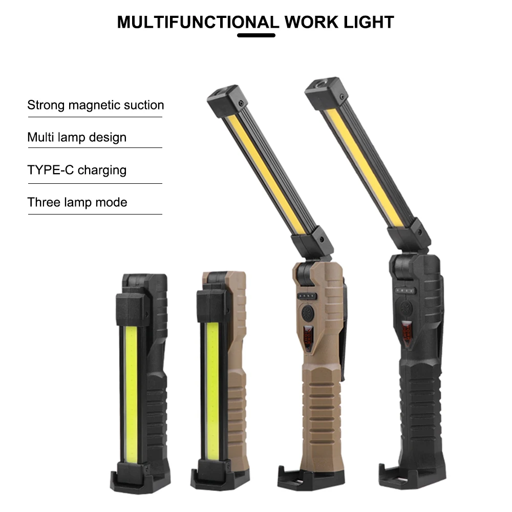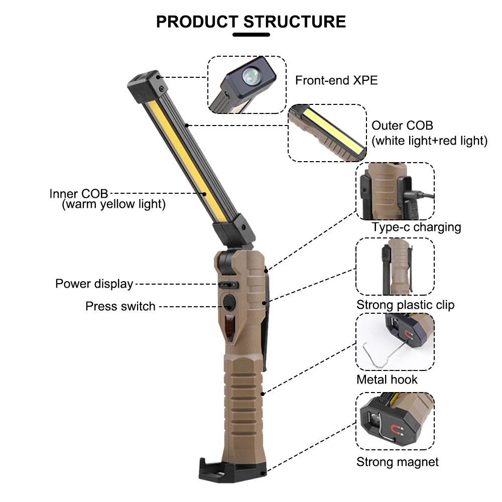 【Foldable & Versatility】With the foldable design, the emergency work lights are compact and easy to carry. With 7 Lighting Modes can be used as a handheld flashlight, work light, grill light, table lamp, or alert light. Which is perfect for car repair, emergency, garage, power outages, home lighting, and Gifts for Christmas, Birthdays. Material: ABS Bulbs: Inner COB (warm yellow light)+outer COB (white light+red light)+front light XPE Switch: Press the switch Battery capacity: built -in 1200mAh battery Power form: charging Charging method: Type-C USB Charging Support Output 5V 1A Power: 5W Light source: LED 7 Modes: COB yellow light strong light-cob-xpe strong light-COB white light strong light-COB white light weak light-9*cob red light Zooming method: fixed focus Waterproof level: IPX4 Lishu: 300-400 lumens Charging time: 3-4 hours Endurance time: 4-5 hours Use environment: hiking, camping, defense, teaching, search, hunting, daily carrying, night ride, cave and night fishing, patrol Maximum range: 50-100 meters Features: power display, double -sided COB, 3 -hour light source selection, USB output, can be used for charging treasure, can be folded at 180 ° up and down, with magnets and hidden hooks, which are convenient for vertical and handheld. Red light warning Indications: Four blue LED indicators, 25%-50%-75%-100%flashes, full of bright Package contains: Working light*1 USB Cable*1