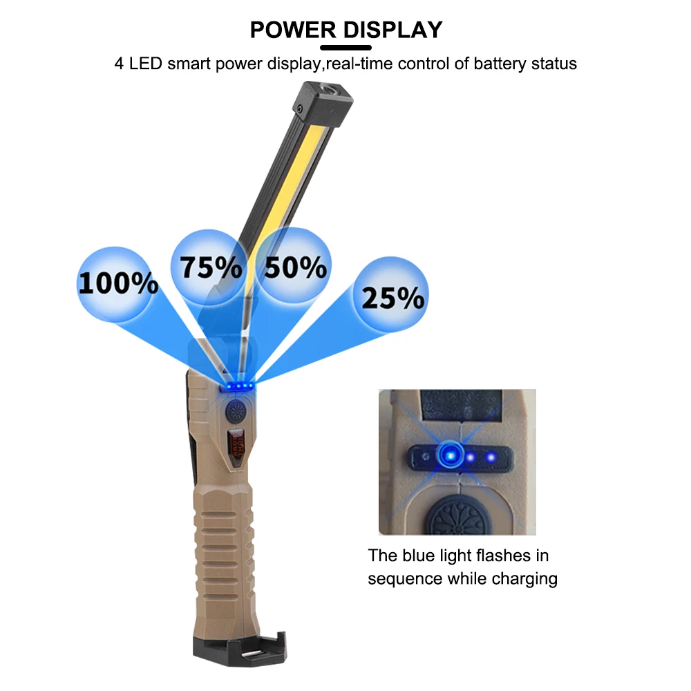 【 Long-lasting battery & Power Indicator】Built-in rechargeable battery, with long-lasting battery life, the led work light can last up to about 6-7 hours at Hight light mode after full charge, and only took about 3 hours to fully charge from 0%-100%. 4-level power indicator allows you to check the remaining battery and ensure rechargeable the portable work light in time.