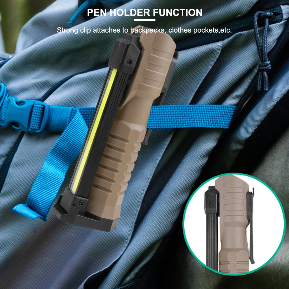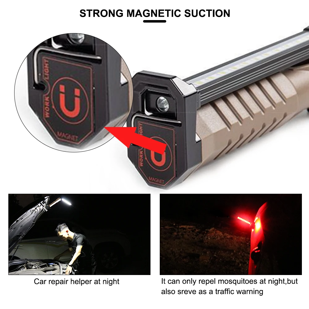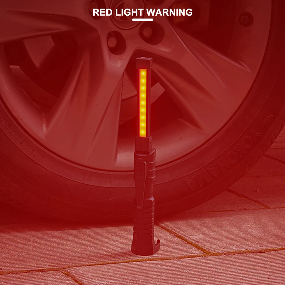 【2 Light source & 7 Lighting Modes】This work light features 2 light sources: LED flashlight and COB work light. It has 7 lighting modes includes: (Inside light 2 Modes): COB Yellow Light ( High / Low); 1 Front Light Mode; (Outside light 4 Modes: 2 White Light & 2 Red Light ): COB White Light ( High / Low); COB Red Light( High / Flashing), which satisfy your various needs. (long press the switch button to turn it off).
